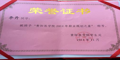 公司2013级预防医学专业李丹同学, 在公司举办的贵阳医公司第三届老员工职业生涯规划和创业计划大赛决赛中,经过激烈角逐后,以优异的成绩获得“贵阳医公司2014年职业规划之星”的荣誉称号。