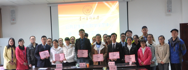 经过2个小时的激烈的角逐,根据决赛现场评审与答辩综合成绩和评委评议意见。食品卫生与营养学专业2013级方海英、周群兰、任会飘同学设计作品“白酒中甲醇检测笔的研制”荣获一等奖;卫生检验与检疫专业2012、2013级陈圆圆、沈文婕、朱海建同学设计作品“贵阳市管网末梢水中主要氯化消毒副产物的含量及不同煮沸时间对其影响的研究”,预防医学专业2011级梁秋果、全科医学专业2013级武雅楠、临床医学2013级文赛、医学实验技术2014级肖鑫、李欣芯同学设计作品“贵阳市南明河流域居民区周围不同生境蚊类多样性调查”荣获二等奖;预防医学专业2013级梁月辉、郑涛同学设计作品“pH计法间接检测牛奶中抗生素的研究”,卫生检验与检疫专业2013级周光云、黄瑶、瞿广胜同学设计作品“贵安新区大学城员工饮用桶装水安全风险的评估”,卫生检验与检疫专业2014级黄一铭、闫维维、程远萍、潘丽忠、文冰阳同学设计作品“贵州省农村垃圾处理现况调查及存在问题初探”荣获三等奖;同时,根据初赛班级参与率以及获奖情况,评选出组织奖2个,分别为食品卫生与营养学专业2013级和卫生检验与检疫专业2013级。公共卫生公司领导和各位评委专家为获奖团队颁发奖状、奖金,并与获奖选手合影。