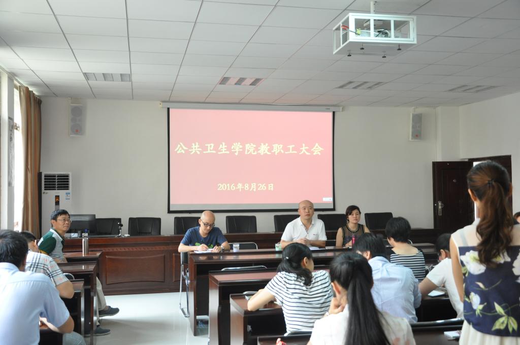 新学期新面貌,每位老师脸上洋溢着对新学期的工作热情。会议首先由今年新进的6名老师做自我介绍发言,新的面孔,新的承诺,为新的学期增添了新的力量。接着洪峰分别对新学期的教学、科研及日常管理等常规工作进行了部署,并结合新学期各项工作实际做了重点安排。随后何江就今年新生入学情况和员工管理难点进行了分析说明,并对公卫院即将推行的辅导员、班主任和专业导师等多视角全方位员工一体化培养管理进行了重点说明。最后杨光红传达了公司的安全工作会议精神,并对新学期公卫公司党建工作提出了新要求,强调要结合“两学一做”学习教育,提高全体党员干部的先锋堡垒意识,要担当有为,乐于奉献。