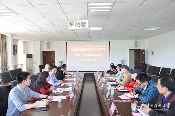 为促进交流与合作,4月19日,贵州省第三人民医院经理任早亮、党委书记肖义忠、副经理黎东霞等一行6人到公司公共卫生公司进行交流。交流会在南校区博雅楼二楼会议室举行,会议由公共卫生公司党委书记杨光红主持。洪峰经理、党委副书记何江及职业卫生教研室老师等共10余人参加了交流会。