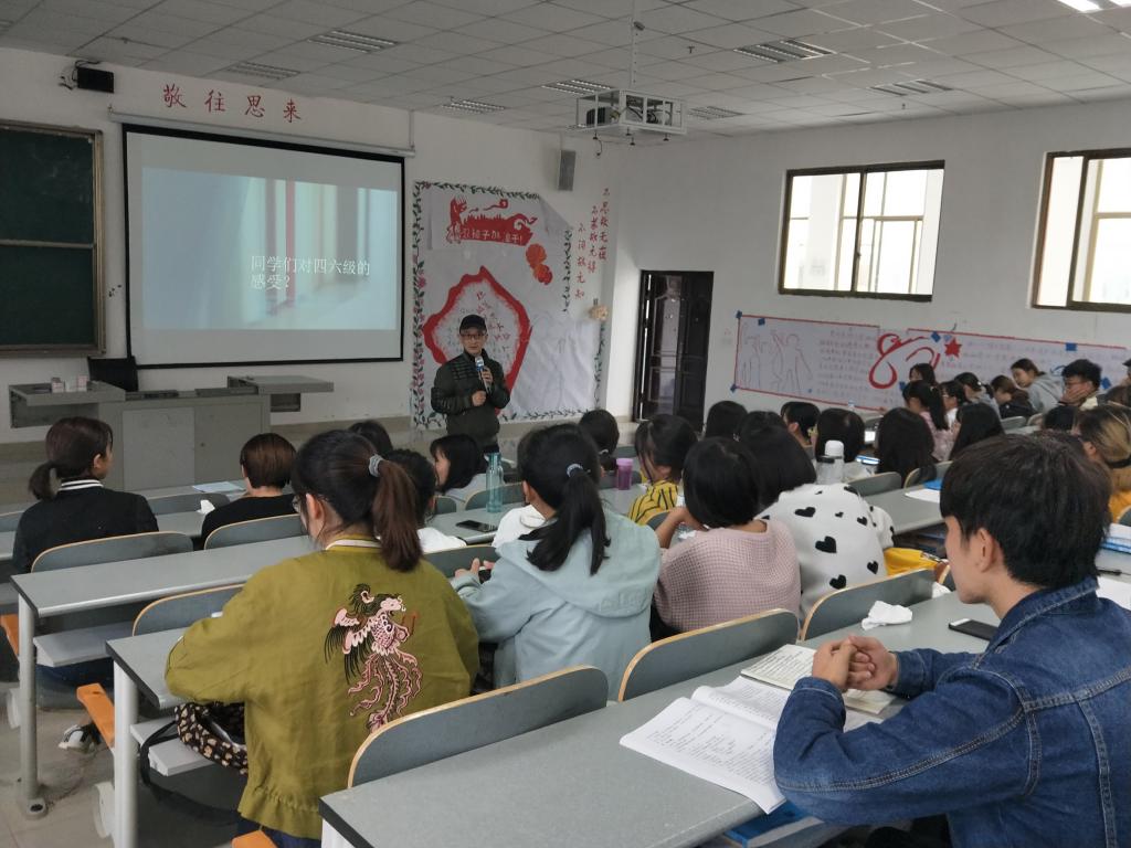 【公共卫生公司党委副书记何江与2017级预防医学甲班】5月29日,何江在2017级预防医学甲班召开的“四六级,你准备好了吗?”的主题班会上,通过自己在员工时期学习英语的经历,强调同学们在学习英语的过程中要培养学习的兴趣,更要重视持之以恒的积累和运用。
