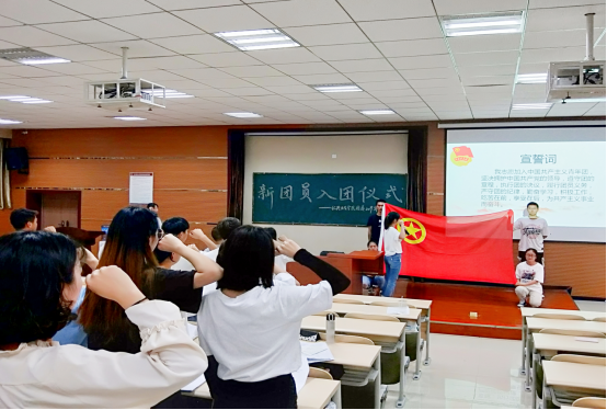 随后,由公共卫生公司团委副书记李頔同学领誓,全体团员面对鲜艳的团旗,右手握拳,新团员进行了庄严的入团宣誓,老团员重温了入团誓词,嘹亮而坚定的宣誓声久久回荡。