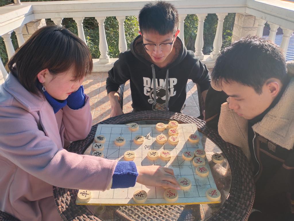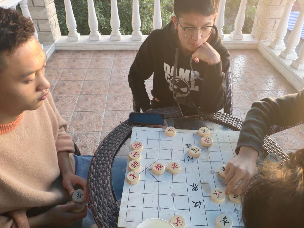在传唱革命歌曲的同时,下象棋活动也拉开了序幕。象棋是中华民族的文化瑰宝,它源远流长,趣味浓厚,千百年来长盛不衰。对战过程中,双方认真思考,谨慎行棋,冷静应对,不断激发自己的潜能,扩展思维。虽表面十分平和,棋盘上已经上演着激烈的“楚汉争霸”。此项活动丰富了研究生们的课余生活,锻炼了逻辑思维能力。