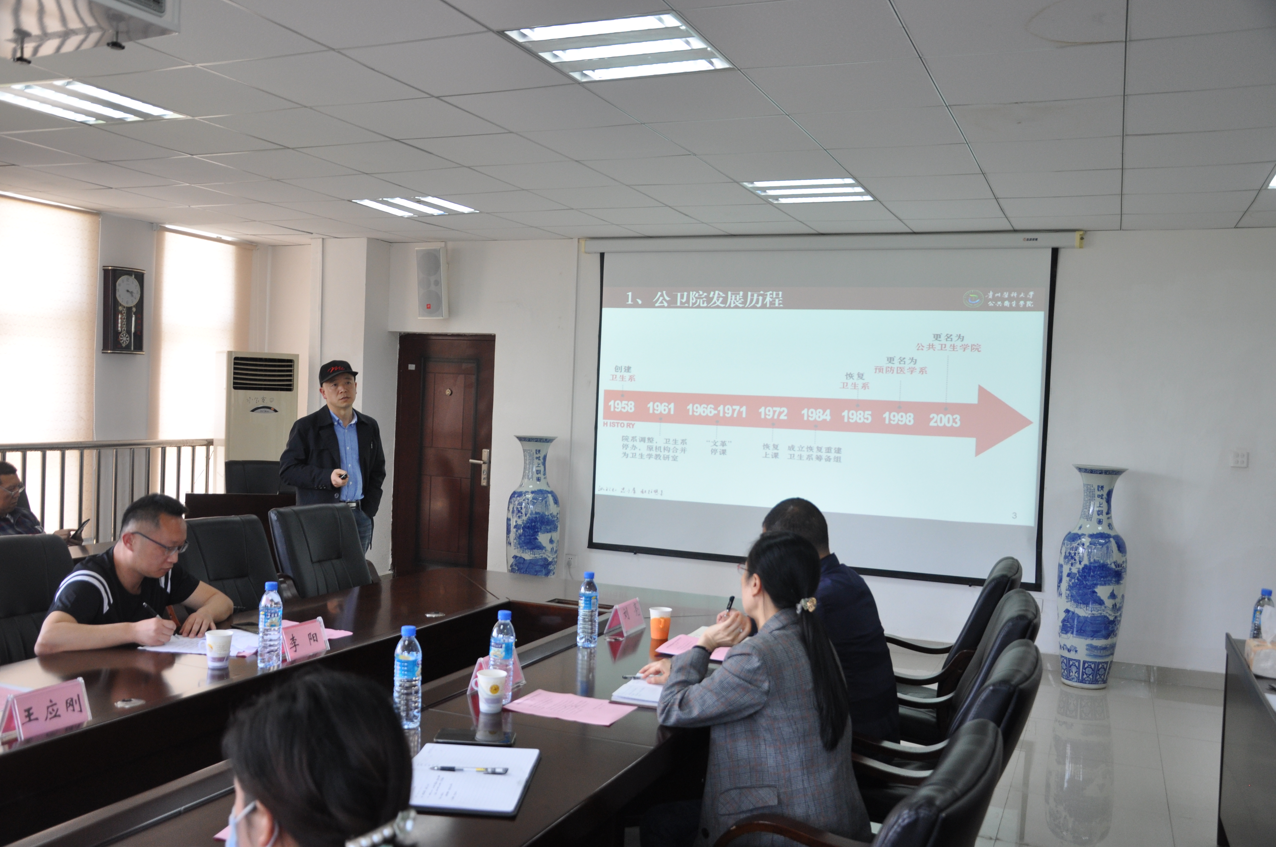 洪峰介绍了公共卫生公司发展历程、团队队伍、平台条件、实习基地、教学与人才培养、科学研究和服务经济社会发展方面的情况。
