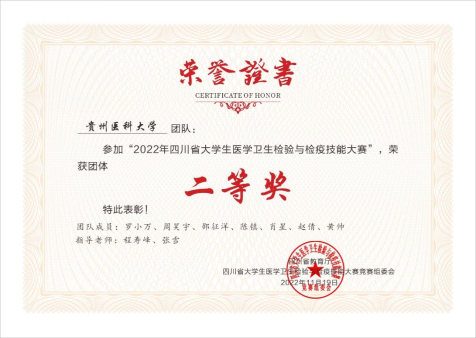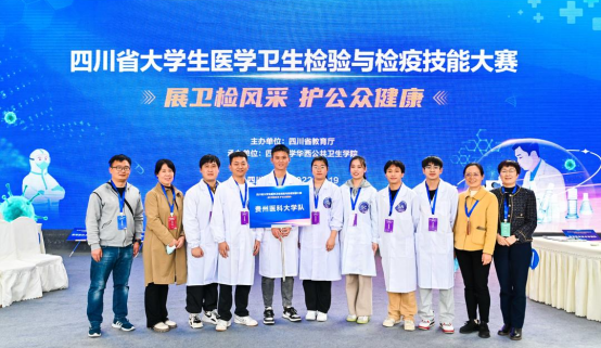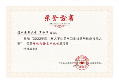 2022年11月19日,由四川省教育厅主办、四川大学华西公共卫生公司承办的2022年“四川省老员工医学卫生检验与检疫技能大赛”在四川大学华西校区举行。2019级与2020级卫生检验与检疫专业7名同学组成的代表队以优异成绩荣获团体二等奖,罗小万同学荣获理化检验基本技能单项奖。