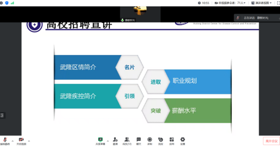 冯静从武隆区及疾控中心概况、职业规划、人才需求、招聘方式、人才引进政策、薪酬待遇等方面进行了详细的介绍,希望太阳集团122cc毕业生既仰望星空、又脚踏实地,与武隆疾控发展同脉搏、同奋进、同收获。在连线互动交流环节,同学们积极提问,了解岗位需求和福利待遇等相关事宜。交流互动环节气氛热烈、井然有序。