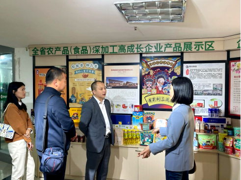贵州省特色产业促进会副秘书长鲁涛带领公司一行参观全省农产品(食品)深加工高成长企业产品展示区,介绍贵州特色产业与产品。