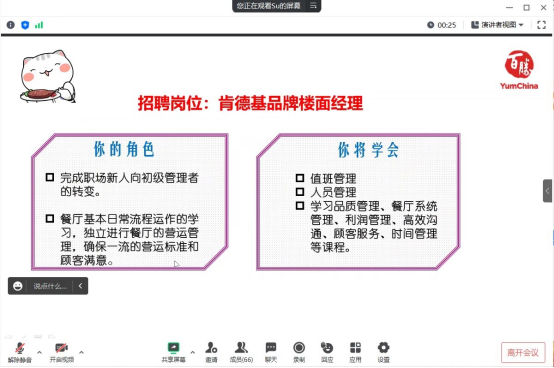 郑小宁对公司概况、2023年校招计划、招聘岗位、晋升渠道等多个方面进行详细介绍,欢迎更多的毕业生加入百胜,与公司一起成长和进步。会后,负责人对同学提出的问题进行了答疑。