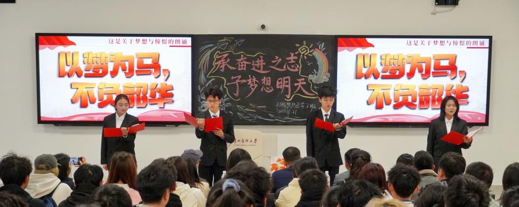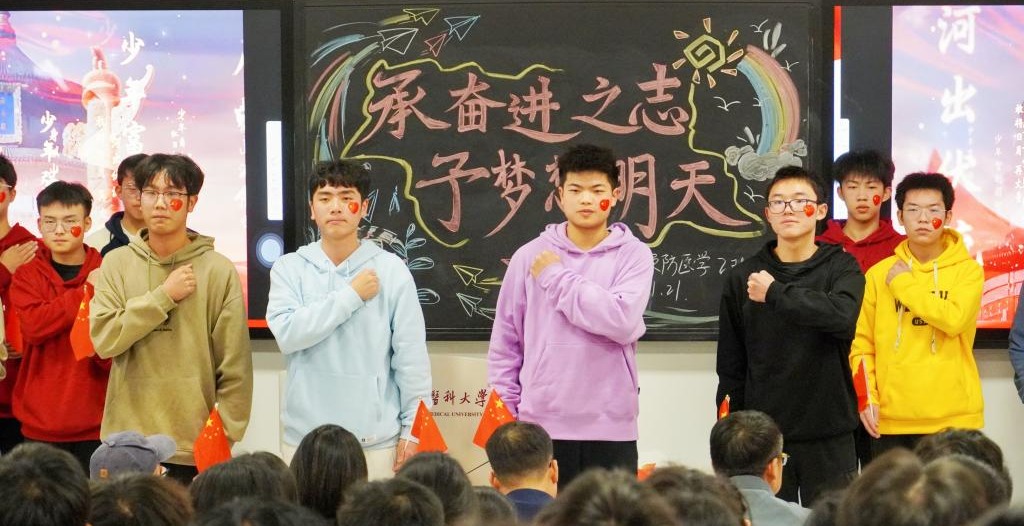 班会上,同学们通过介绍班级风采、诗歌朗诵《以梦为马,不负韶华》、大合唱《少年中国说》等形式,开启对老员工活的无限期望。同时,同学们在现场聆听前辈和榜样的故事,领悟贵医精神,思考作为新时代青年的责任与担当。