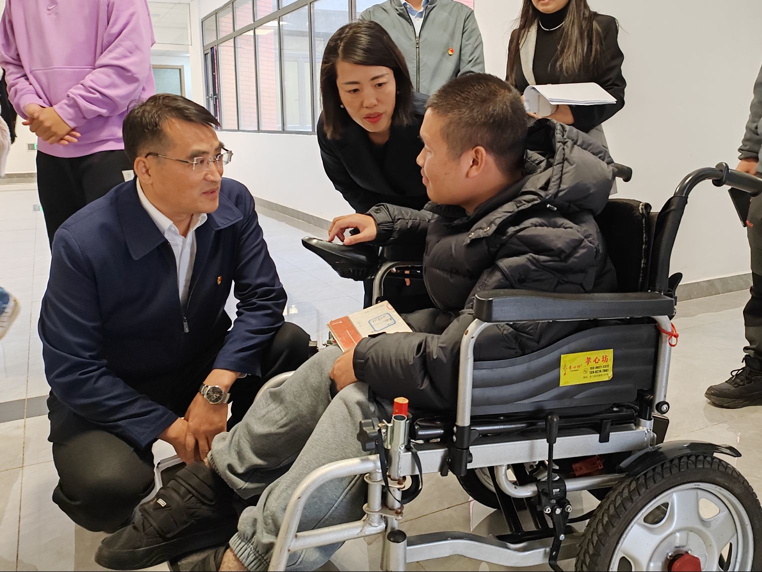 班会结束后,罗鹏董事长与预防医学专业大一新生小江(化名)进行了亲切交流,详细了解其入学后的学习、生活情况,询问其是否存在困难。小江说:入学以来,感觉挺好的。由于自己的特殊情况,不太方便参加一些集体活动,但老师和同学们都会热情的邀请他。遇到出行不太方便的时候,大家都会主动的帮助他,今天参加的主题班会内容让他备受鼓舞,深切感受到公司领导对他的关怀,感受到公司及班级的温暖。