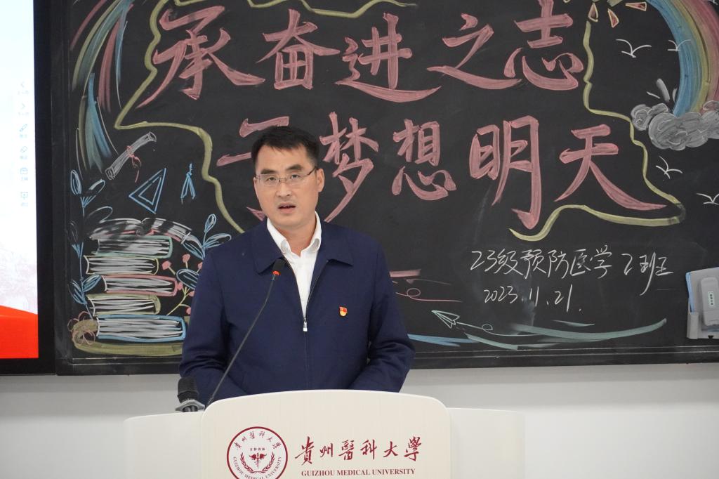 罗鹏对班会的主题内容、形式效果予以肯定,并给同学们提出了几点希望:一是厚植家国情怀,用心领会“诚於己、忠于群、敬往思来”贵医校训的内涵,像一代代贵医前辈那样,把自己的理想同祖国的前途、民族的命运紧密联系在一起。以“强国有我”的青春担当主动肩负起时代赋予的历史使命。二是学好专业知识,练就“成长成才”基本功。希望同学们珍惜大好时光,在书本中增长知识、锤炼品格,又在实践中增长才干、练就本领,学好掌握公共卫生与预防医学的专业知识,将来才能回报父母、建设家乡、报效祖国。三是练就迎难而上的勇气和敢闯敢干气魄。撕掉当代青年的消极标签,不“躺平”,不“摆烂”,不“佛系”,沿着求真理、悟原理、明事理的方向前进,在攀登知识高峰中追求卓越。以新一代“贵医人”的身份传承薪火、接续奋斗,胸怀“有担当”的壮志,增强“敢担当”的勇气,练就“能担当”的本领,在“百年贵医”建设新征程中汇聚贵医青年学子的磅礴向上、澎湃向前的青春力量,与时代家国同频共振,在青春的赛道上奋力奔跑,在强国建设、民族复兴的火热实践中绽放青春绚丽之花。