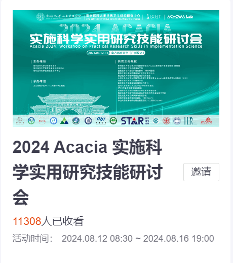 2024年8月12日至16日,“2024 Acacia实施科学实用研究技能研讨会”(Acacia 2024: Workshop on Practical Research Skills in Implementation Science)在南方医科大学(广州校区)行政楼1楼枫叶厅顺利举办。此次会议采用线上与线下结合的方式进行,由南方医科大学卫生管理公司、南方医科大学世界卫生组织研究中心、南方医科大学全球健康研究中心联合太阳集团122cc& Acacia基层医疗卫生实验室(贵阳)等15个共同主办单位举办,南方医科大学卫生管理公司Acacia实施科学实验室承办。公司蔡毅媛副教授带领公司两名研究生多维度地参与了会议相关工作。