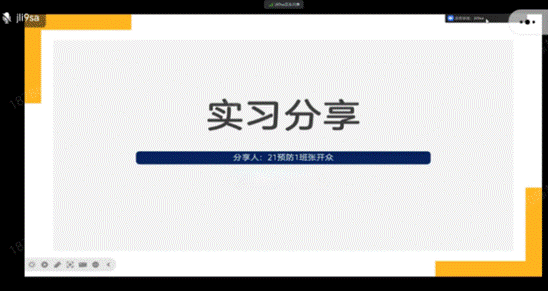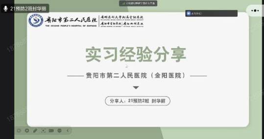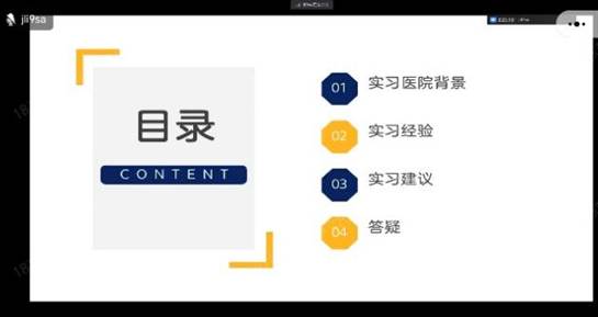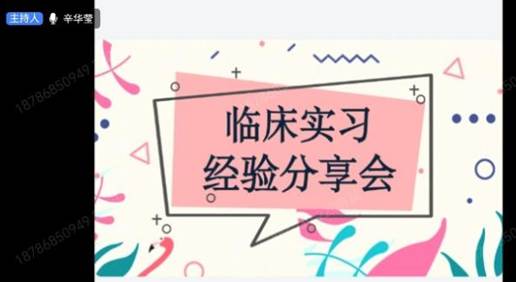 动员会当晚19:00,公司通过腾讯线上会议平台开展了临床实习经验分享,会议邀请到2021级的学长学姐张开众、封华丽,两位同学结合自身经历,从实习医院情况介绍、科室轮转注意事项、医患沟通技巧等方面进行细致分享,并针对同学们关心的热点问题倾囊相授。在线参会的同学们通过参加经验分享,对临床实习有了更清晰的认识,将充分借鉴经验迎接挑战。