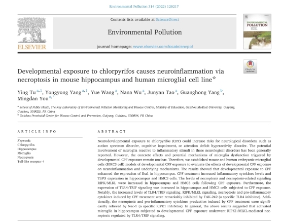 2022年9月,环境科学领域专业期刊《EnvironmentalPollution》(中科院分区2区,IF=9.988)在线发表了公司杨光红教授团队的研究论文“Developmental exposure to chlorpyrifos causes neuroinflammation vianecroptosis in mouse hippocampus and human microglial cell line”