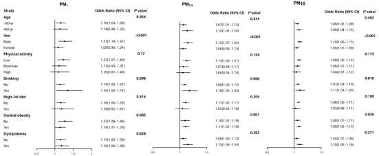 分层分析发现PM暴露与胆结石患病风险之间的关联性在男性、饮酒者和中心性肥胖者中更强。男性、饮酒者和向心性肥胖者的环境PM10暴露每增加10g/m3,胆结石患病风险的比值比(OR,95% CI)分别为1.10(1.06,1.15)、1.11(1.03,1.20)和1.09(1.05,1.13)。PM1和PM2.5也得出类似结果。