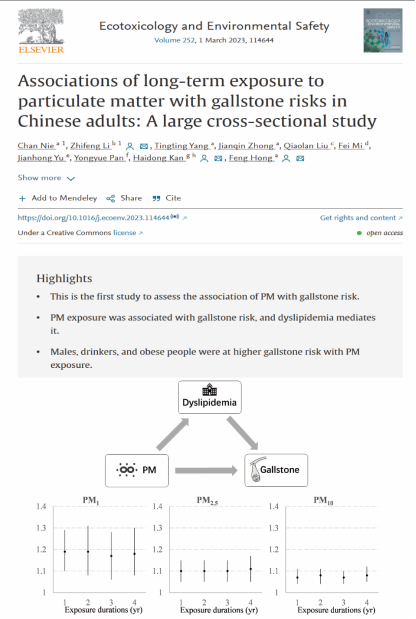 2023年2月14日,环境科学与毒理学领域专业期刊《Ecotoxicology and Environmental Safety》(中科院二区TOP期刊,IF:7.129)在线发表了公司洪峰教授课题组研究论文“Associations of long-term exposure to particulate matter with gallstone risks in Chinese adults: A large cross-sectional study”。该研究基于人群队列研究探索大气污染颗粒物与胆结石患病风险的关联性,并评估了血脂异常的中介作用。