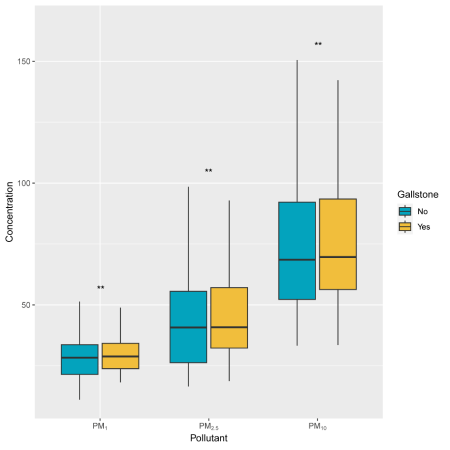 该研究数据来源于国家重点研发计划项目“西南区域自然人群队列研究”基线调查,研究对象来自重庆、四川、贵州和云南四个省份,包括汉族、侗族、苗族、布依族、白族和彝族6个民族共72 893名30-79岁成人。研究发现,胆结石的检出率为7.3%。胆结石组人群暴露于大气污染颗粒物PM1、PM2.5和PM10的浓度要高于非胆结石组(29.04vs. 28.37, 43.86vs. 42.37, and 74.90vs. 72.81mg/m3)(P<0.001)。