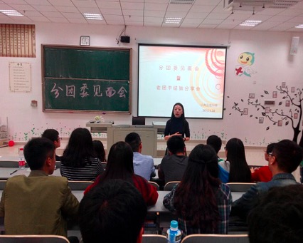 此次见面会柴颖老师介绍了分团委的工作,为同学们分享了她作为团干部的经验,给同学们讲述了要成为一名合格的团干部所需要具备的精神和品格,希望各团干部要在一次次的学习和实践中不断完善自己、充实自己,要学会躬行、学会思考、学会总结。接下来分团委副书记刘思源同学为各团干部介绍本学期的工作计划和安排。并对今后的工作提出了新的要求和规划。最后,公司原分团委副书记胡后芬同学以及优秀团干部冯梦雪同学作为老团干分享了自己一年来的工作经验并对自己的团干工作进行了总结。