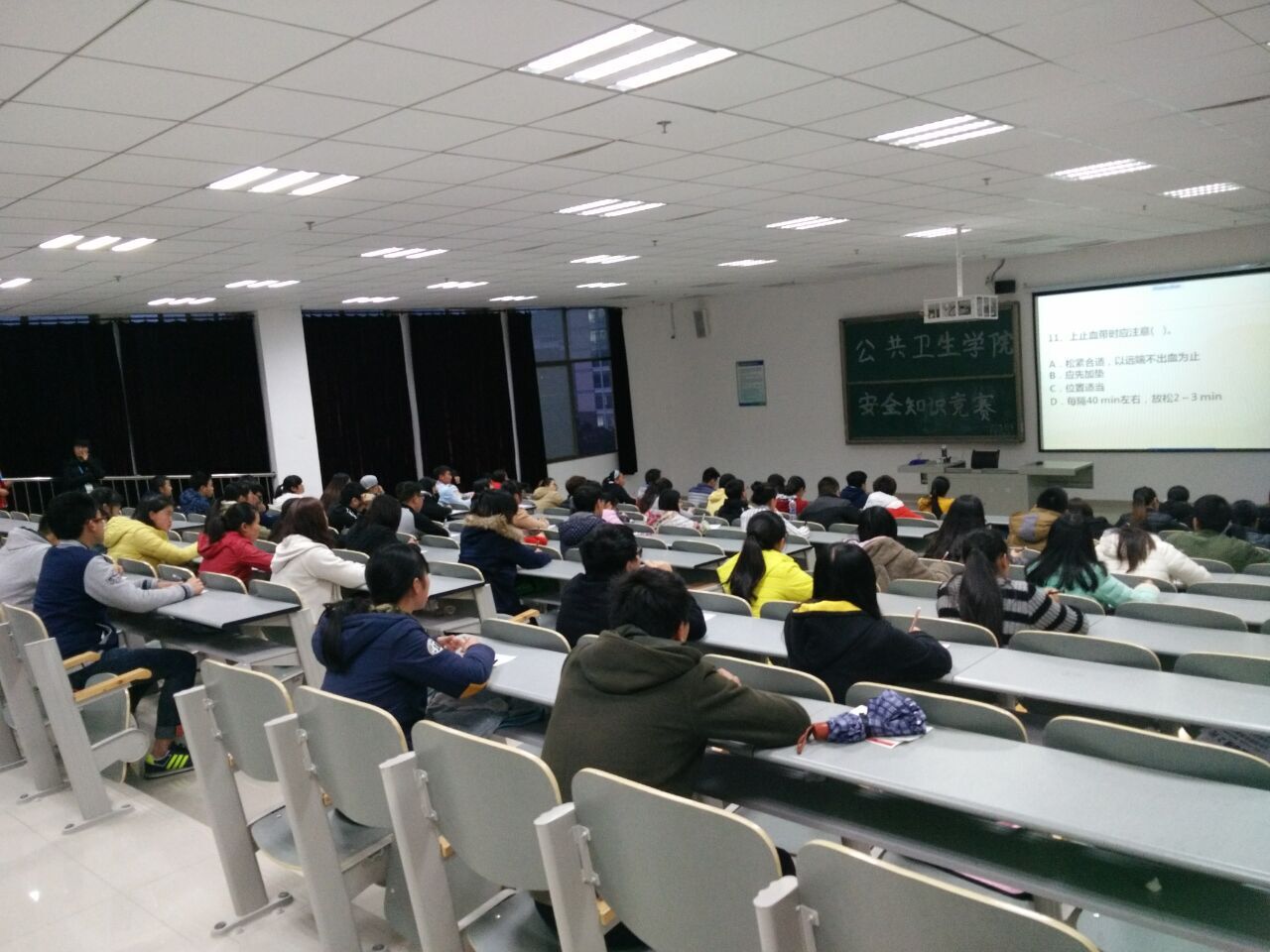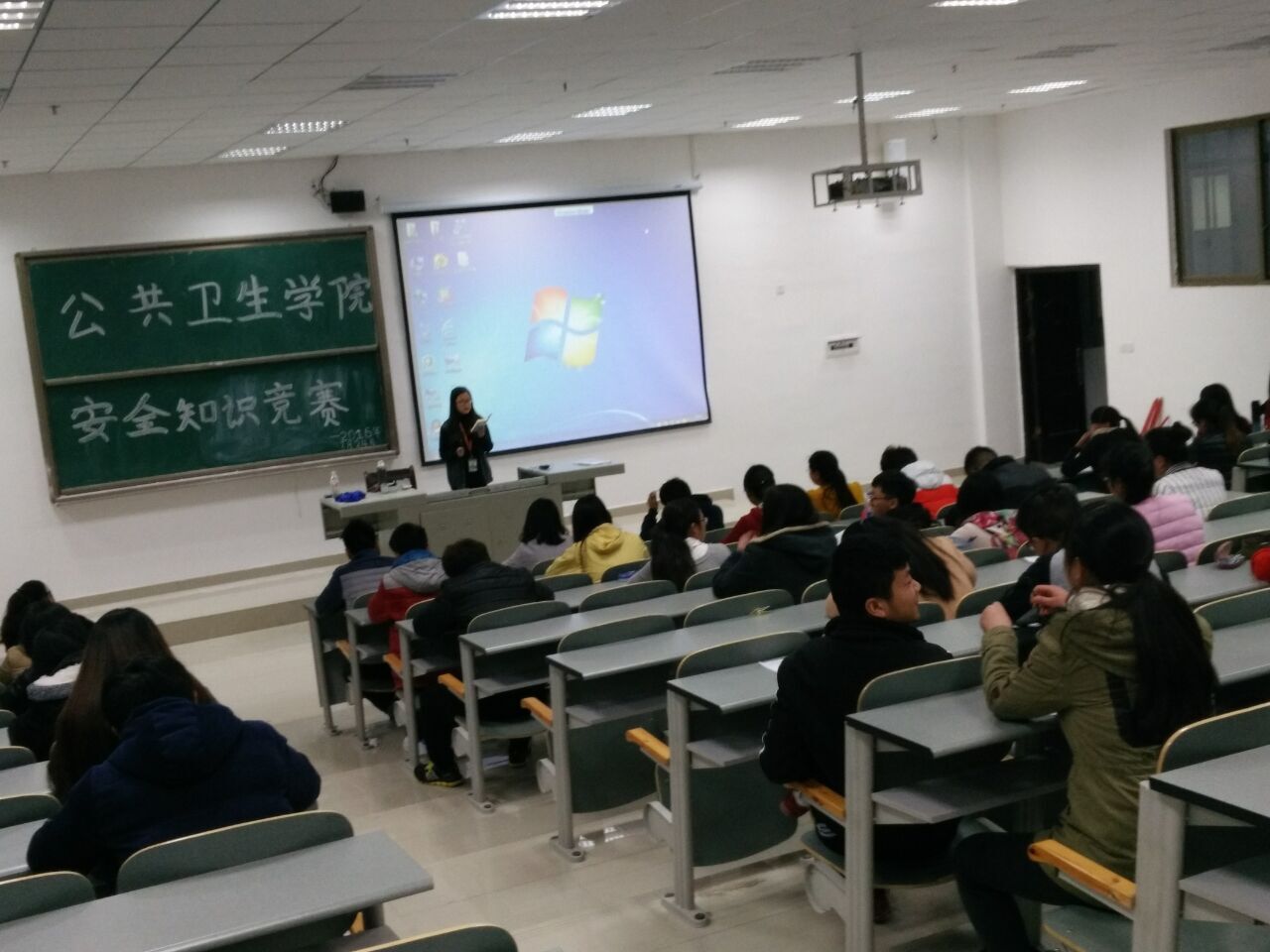 人间三月芳菲始,安全校园你我创。为构建和谐、文明、安全的校园,提高公司学子的安全意识,特在全公司范围内举行安全知识竞赛。此次知识竞赛的内容涵盖了的消防、交通、宿舍安全、防诈骗、禁毒等多方面知识,经过积极地动员、紧锣密鼓地筹备,于2016年3月24日在新校区7505拉开帷幕。本次竞赛从每个班中抽出100余名同学参加,分为初赛和决赛进行。初赛由参加比赛的全体同学进行安全知识笔试,之后通过笔试成绩排名选出前30名同学进入决赛。决赛包括必答题、抢答题、风险题三个环节。通过激烈角逐,2014级食品卫生与营养学专业的陈晓同学和2015级卫生检验与检疫专业的陈凤同学并列获得此次安全知识竞赛的一等奖。2014级食品卫生与营养学专业的欧阳湖同学、2015级预防医学专业的陈玲同学、2015级预防医学专业的马念同学、2014级卫生检验与检疫的田茂勇同学分获二等奖。比赛期间,同学们的实力旗鼓相当、难分伯仲,三等奖由2015级卫生检验与检疫专业的李雪澜同学、2015级预防医学专业的朱晃羚同学、2015级预防医学专业的杨雪梅同学、2015级食品卫生与营养学的廖银霞同学、2015级预防医学专业的卜美娥同学、2015级食品卫生与营养学的杨妮芹同学、2015级预防医学专业的吕祯同学、2015级食品卫生与营养学的郑远翠同学共同获得。