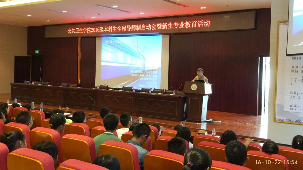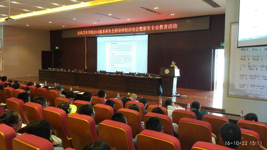 10月22日(周六)下午14:00,“公共卫生公司2016级本科生全程导师制启动会暨新生专业教育活动”在公司南校区道德讲堂举行,公共卫生公司经理洪峰、党委副书记何江、各专业负责人、各科室负责人、本科生导师、辅导员及2016级预防医学专业、卫生检验与检疫专业、食品卫生与营养学专业全体本科生共计350余人参加,启动会及新生专业教育活动由何江主持。