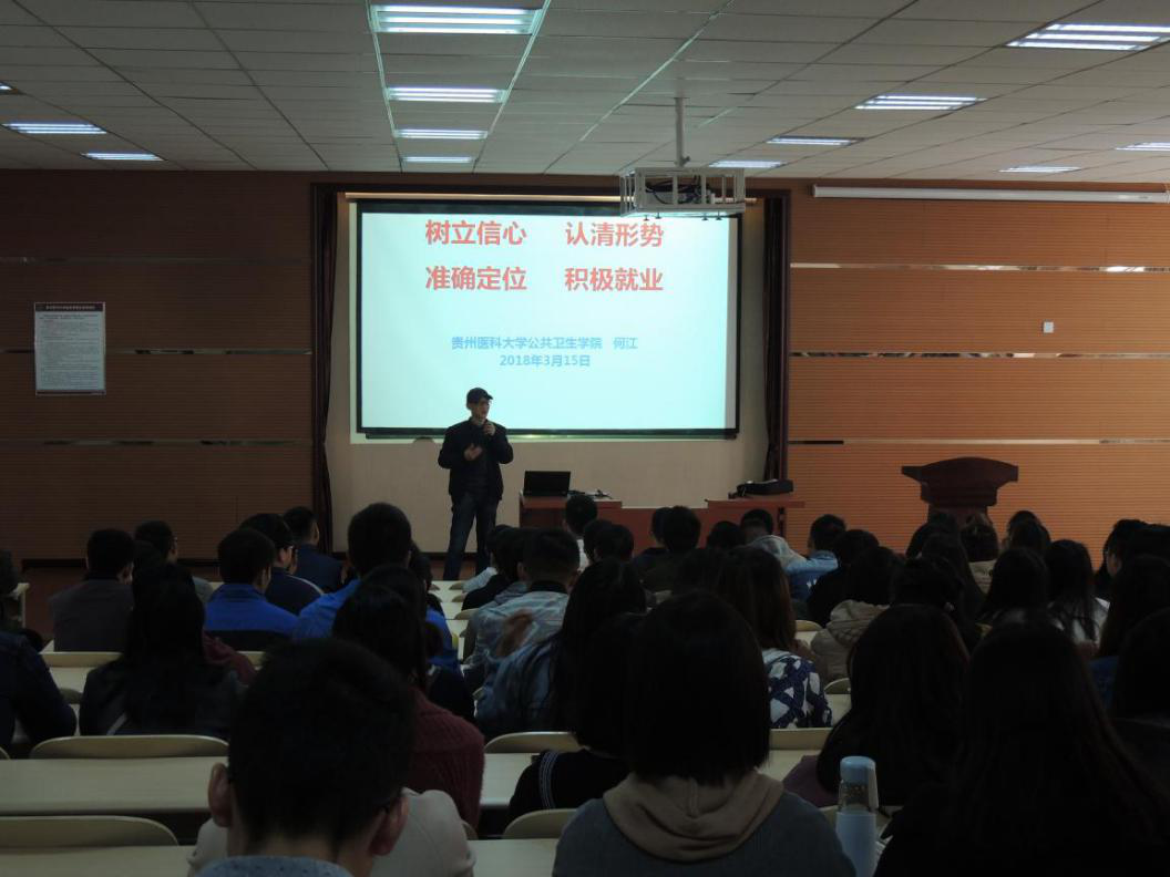 何江首先对2018年的全国老员工毕业就业形势、国家基层就业“主旋律”和服务国家需求“大舞台”政策导向、国家公共卫生事业发展与人才需求以及公共卫生公司近3年的毕业生就业情况进行了详细分析。叮嘱同学们首先要树立“天生我才必有用”的就业信心;其次要勇于转变自身就业观念,努力做到从“一步到位”到“骑马找马”转变、从“眼高手低”到从“基础干起”转变、从“被动就业”向“主动就业、创业”转变;再次要紧扣国家人才战略和就业政策导向,结合和自身的综合实力与专业方向,明确就业方向,对自己想干什么,能干什么要有清晰的思路和长远打算,积极就业。期望2018届全体毕业生通过自己的不懈努力和坚持,迈好职业生涯第一步,为实现自己的人生理想和目标奠定坚实基础。