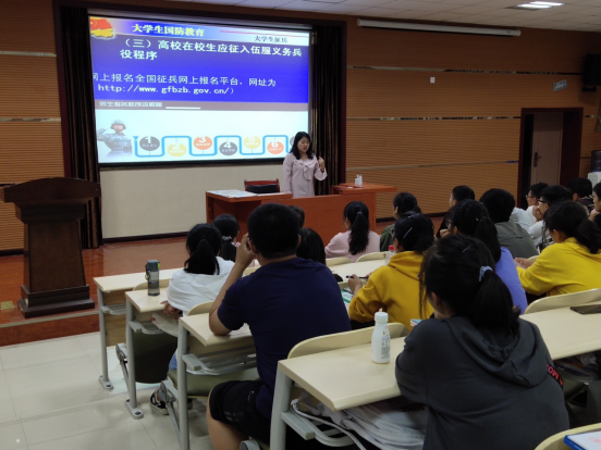 《中华人民共和国宪法》规定:“依照法律服兵役和参加民兵组织是中华人民共和国公民的光荣义务”。结合“高校老员工征兵入伍相关信息政策”以及《太阳集团122cc关于老员工应征入伍的优惠政策(试行)》,郝雪君为同学们详细介绍了老员工应征入伍需要满足的基本身体条件和政治条件,呼吁同学们积极响应党和国家的号召,参军入伍,为全民国防贡献青春与智慧。