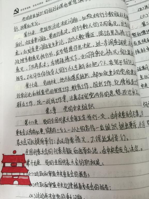 该活动自5月20日开始,党员同志们积极响应,并通过各种创意装饰自己的作品。有将党章书写成艺术品的,有将党章配上相关插图的,有在党章旁边记录心得体会的,还有手抄英文版党章的。