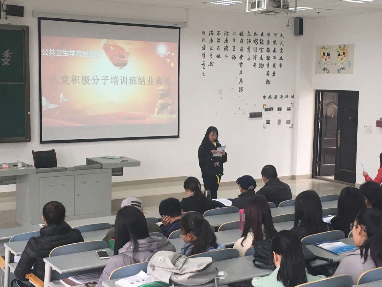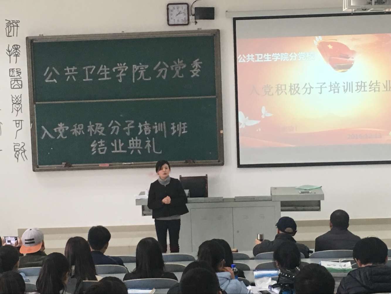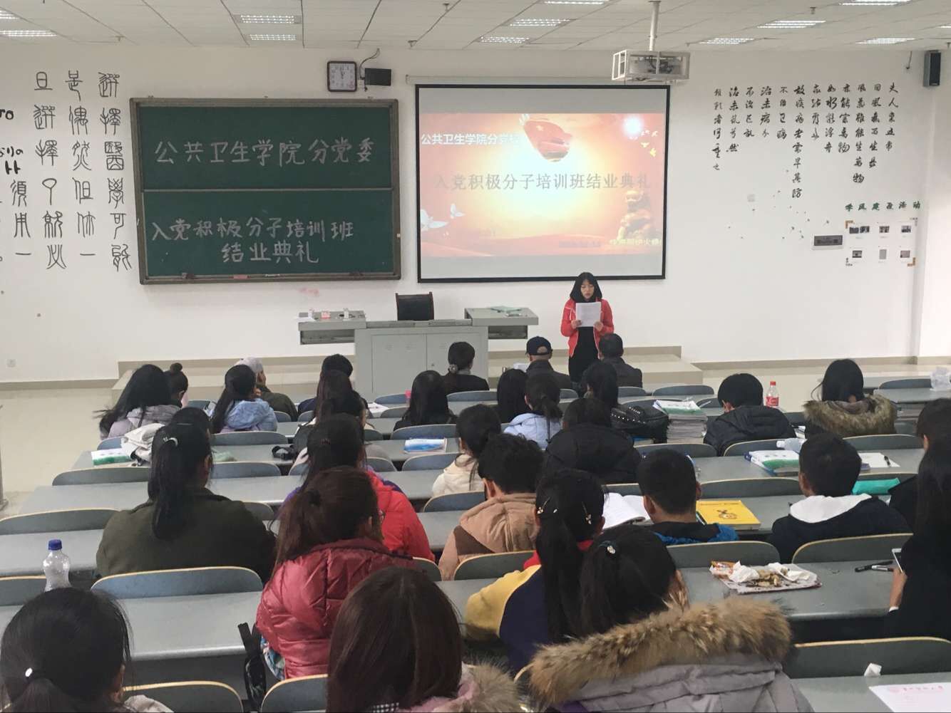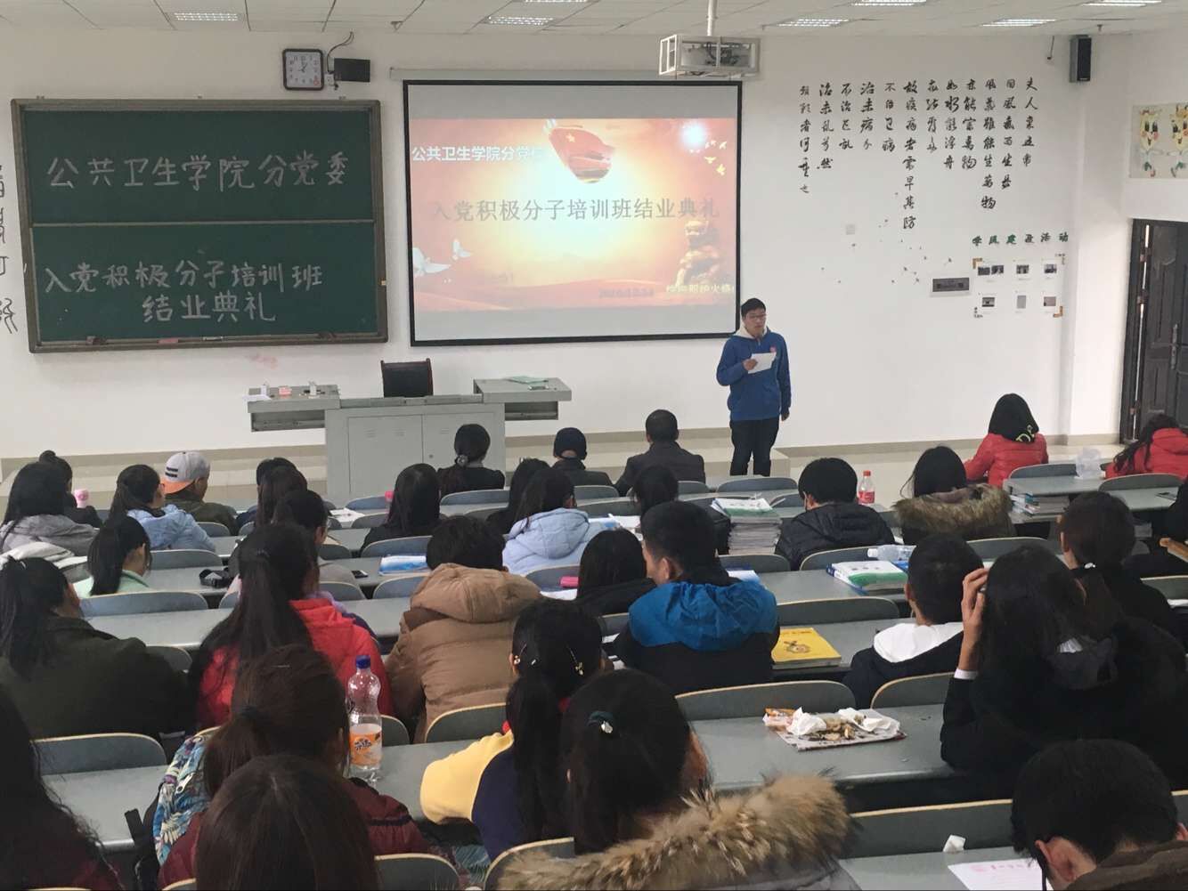 中午,公共卫生公司分党校第45期入党积极分子培训班结业典礼在南校区4505教室举行。公共卫生公司党委书记杨光红、副书记何江、员工科科长兼员工第一党支部书记刘亮,员工第二党支部书记孙静以及101名学员参加了此次结业典礼。结业典礼由孙静主持。