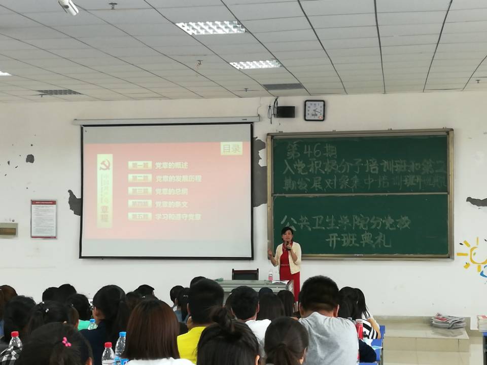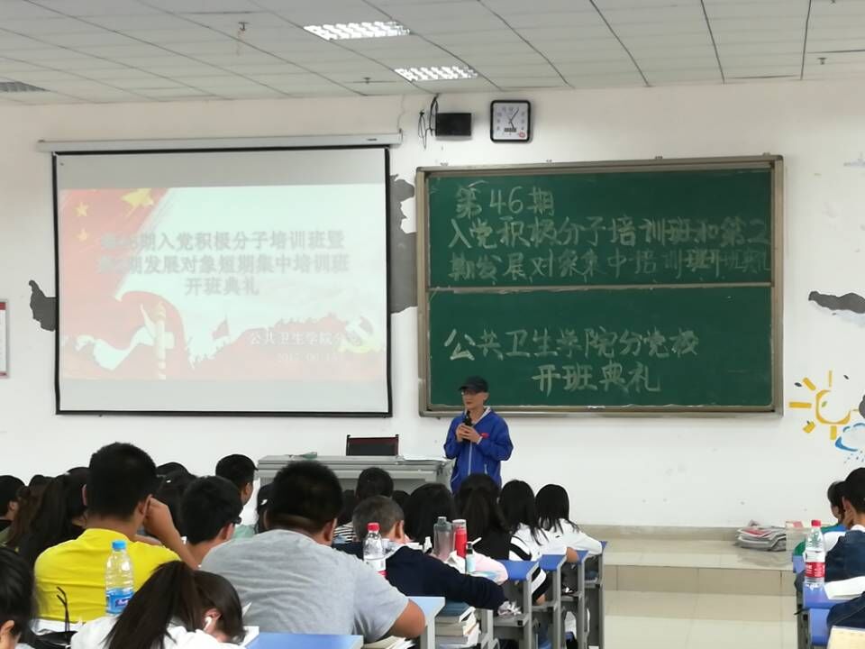 6月15日下午四点三十分公共卫生公司分党校第46期入党积极分子培训班和第2期发展对象集中培训班开班典礼在公司南校区x1501教室举行。公共卫生公司党委书记杨光红、公共卫生公司党委副书记何江、公共卫生公司综合办公室负责人张强、公共卫生公司员工科科长刘亮、公共卫生公司员工第二党支部书记孙静、分团委负责人柴颖出席了本次开班典礼。公司157名入党积极分子及31名发展对象参加开班典礼。开班典礼由孙静主持。